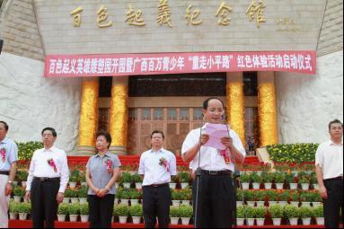 6月28日下午,百色市百色起義紀(jì)念館廣場(chǎng)紅旗招展,紅歌激揚(yáng),百色起義英雄雕塑園開(kāi)園暨廣西百萬(wàn)青少年“重走小平路”紅色體驗(yàn)活動(dòng)啟動(dòng)儀式在這里隆重舉行。廣西自治區(qū)黨委書(shū)記、自治區(qū)人大常委會(huì)主任郭聲琨出席儀式,并與自治區(qū)黨委副書(shū)記陳際瓦,自治區(qū)黨委常委、秘書(shū)長(zhǎng)余遠(yuǎn)輝一道,共同為團(tuán)干部、青聯(lián)委員、青年文明號(hào)集體代表、少先隊(duì)員等青少年“重走小平路”團(tuán)隊(duì)代表授旗,陳際瓦宣布百色起義英雄雕塑園開(kāi)園、“重走小平路”紅色體驗(yàn)活動(dòng)啟動(dòng),嘹亮的軍號(hào)響徹廣場(chǎng)上空,正式拉開(kāi)了“重走小平路”紅色體驗(yàn)活動(dòng)的序幕。
