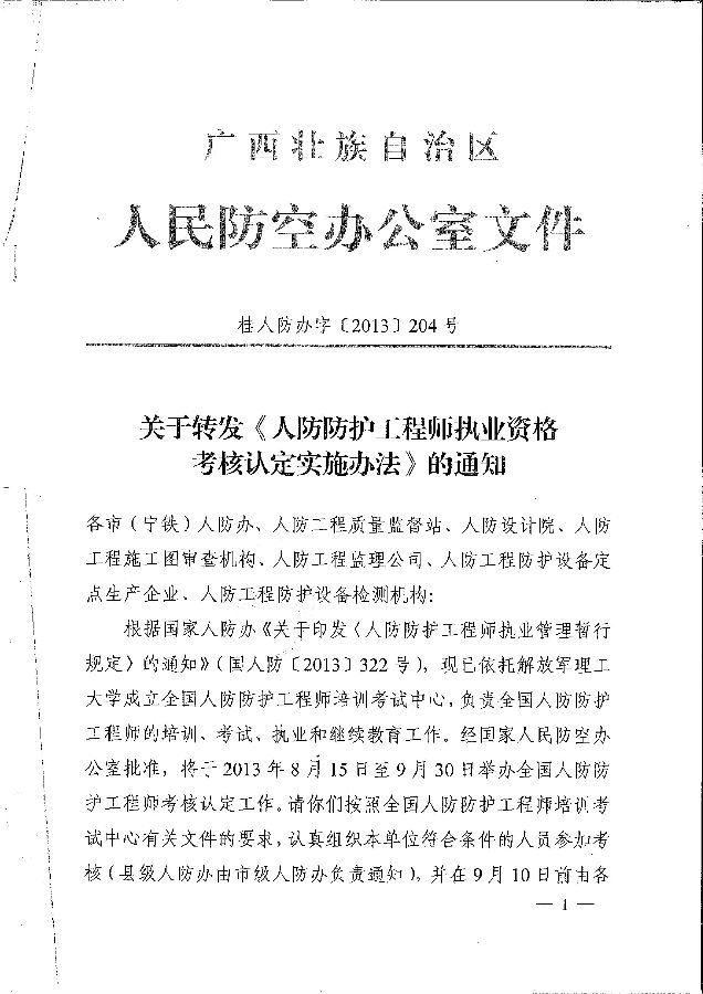 桂人防辦字【2013】204號(hào)關(guān)于轉(zhuǎn)發(fā)《人防防護(hù)工程師執(zhí)業(yè)資格考核認(rèn)定實(shí)施辦法》的通知