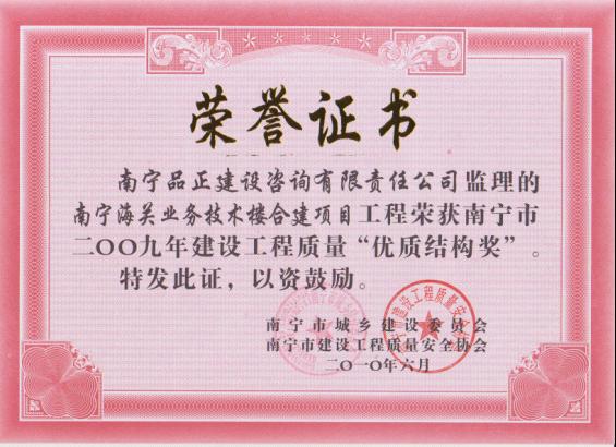 南寧品正負(fù)責(zé)監(jiān)理的金龍·理想1號(hào)5#、6#樓工程、中都·澳海藍(lán)灣工程12#、13#、15#樓工程、南寧海關(guān)業(yè)務(wù)技術(shù)樓合建項(xiàng)目、中華路高層職工住宅樓工程、南寧大商匯1#商業(yè)樓等多個(gè)工程榮獲南寧市城鄉(xiāng)建設(shè)委員會(huì)、南寧市建筑工程質(zhì)量安全協(xié)會(huì)頒發(fā)的南寧市建設(shè)工程“優(yōu)質(zhì)結(jié)構(gòu)獎(jiǎng)”。
