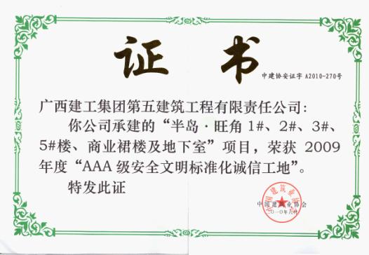 2010年6月,南寧品正負(fù)責(zé)監(jiān)理的半島·旺角1#2#3#5#樓及商業(yè)裙樓及地下室、廣西農(nóng)科院職工住宅樓(科苑小區(qū))工程榮獲中國建筑業(yè)協(xié)會頒發(fā)的 “AAA級安全文明標(biāo)準(zhǔn)化誠信工地”稱號。