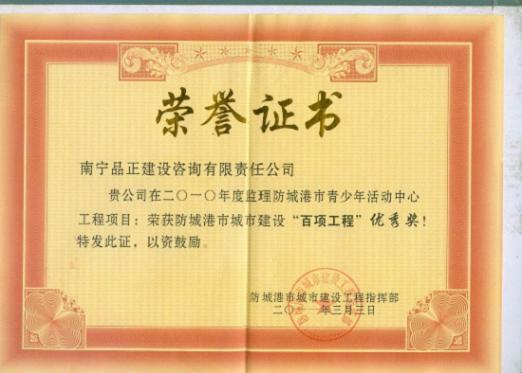 2011年3月3日,南寧品正負責監(jiān)理的防城港市青少年活動中心工程榮獲防城港市城市建設工程指揮部授予的2010年度防城港市建設“百項工程”優(yōu)秀獎。南寧品正將繼續(xù)踐行“科學規(guī)范、承諾守信、嚴格監(jiān)理”質量方針,達到“履行監(jiān)理合同,提供滿意服務”的質量目標。